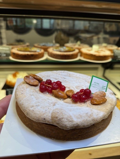 Elle se compose d’une crème d’amande fondante, d’une confiture de fruits rouges légèrement acidulée et d’une dacquoise amande moelleuse et aérienne